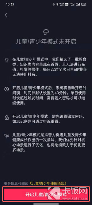4、点击下方的【开启儿童/青少年模式】按钮;
