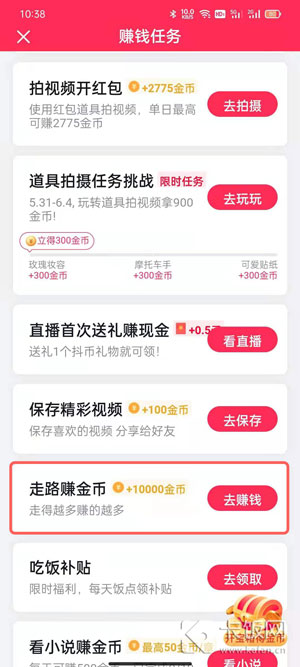2、在赚钱页面滑动,找到任务【走路赚金币】任务,点击【去赚钱】;