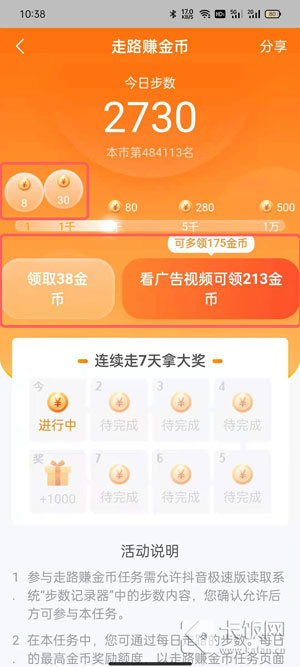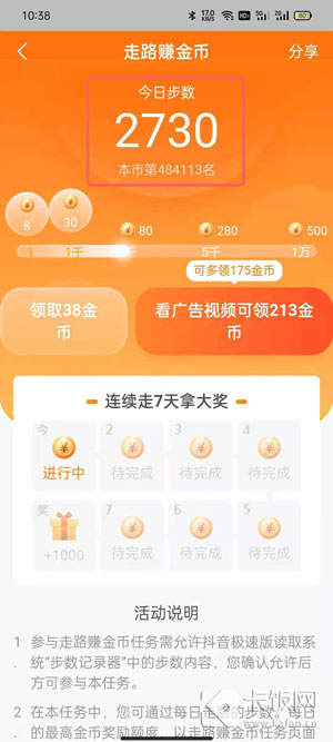 3、在授权抖音极速版获得手机走路步数后,将显示今日走路的步数,和对应的金币;