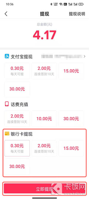 4、滑动页面找到下方的银行卡提现,选择需要提现的金额,点击【立即提现】;