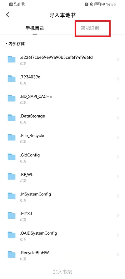 4、然后会进入到手机目录中,如果能找到小说就点击选中,如果找不到,就使用智能识别,自动识别出TXT文件;