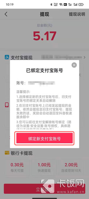 5、如果需要修改,点击【绑定新支付宝账号】,完成绑定进入下一步操作;