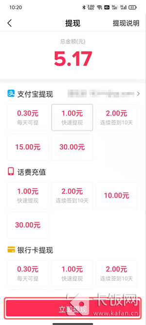 6、选择需要提现的金额,需要注意的是,部分提现金额需要满足条件才可提现,例如提现2元,需要连续签到10天才可以使用;