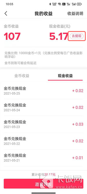 3、点击右上角的【去提现】,将赚到的金额提现到账户中;