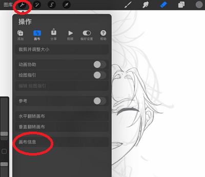 1、首先需要打开软件,然后打开我们想要查看的作品,之后点击左上角的【扳手】图标,在展开的功能选项界面中点击【画布信息】进入到界面中;