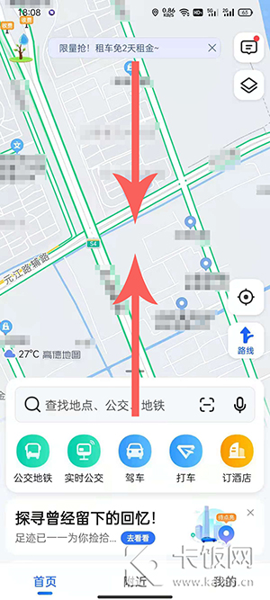 2、在首页,用两个手指缩放地图比例大小,将地图缩小;
