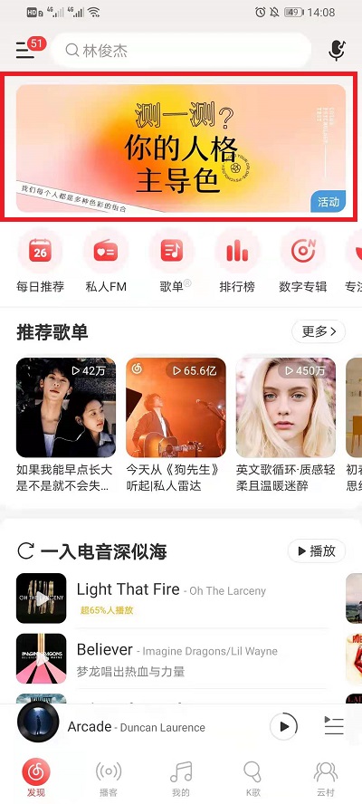 1、首先我们打开手机,然后找到网易云,点击进入到首页中,在首页的轮播上方就可以看到【测一测你的人格主导色】点击图片进入活动,如果进入到软件中没有找到,就需要用户更新到最新版本的网易云(8.2.20版本),然后查看轮播,有可能会出现进入到软件后轮播不是第一个的情况;