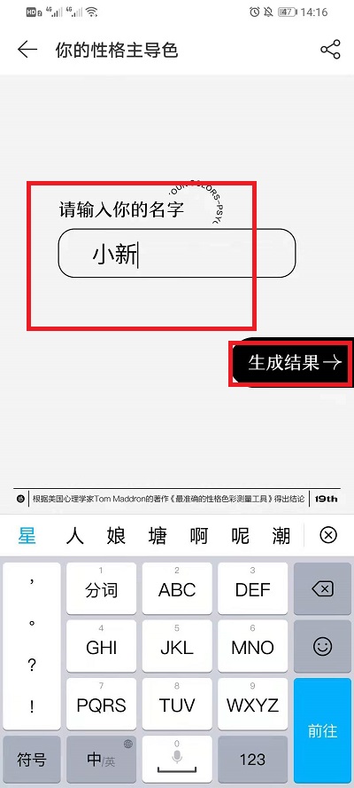 4、然后就需要用户开启做题模式,通过八道题目帮助用户了解自己的性格主导色,选择完成后输入姓名就可以生成性格主导色;