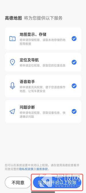 5、进入之后会需要重新获得授权信息,点击【同意并开启以上权限】进入高德地图;