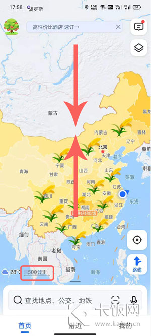 6、最后在首页地图中,使用手指缩放页面,直到左下角限制【500公里】即可看到全中国的水稻。
