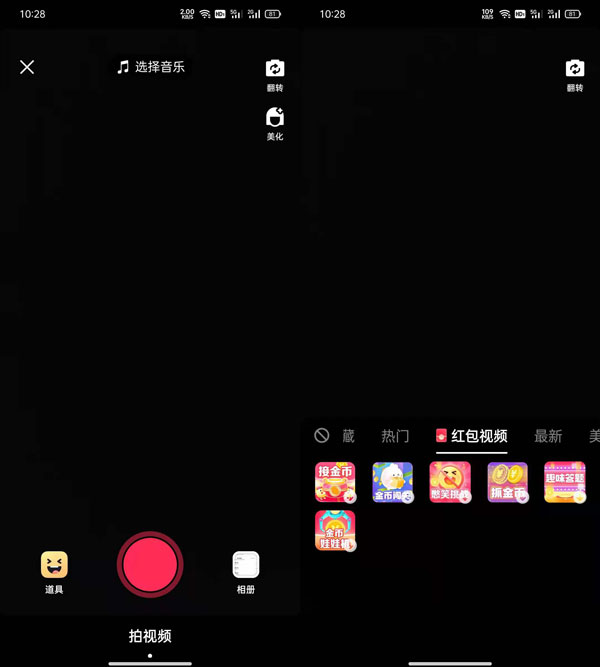 不过抖音极速版中的拍摄页面非常简单,只有简单的拍视频功能,且只提供道具、音乐、美颜等效果,如果拍同款时,抖音极速版并没有改特效将直接跳转到抖音中。
