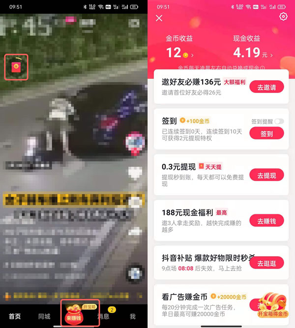这个赚钱功能是抖音中所没有的,只有通过抖音极速版才可以使用。