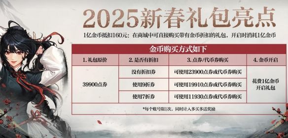 2、本次的新春礼包支持用户使用金币购买,1亿金币抵扣160元;