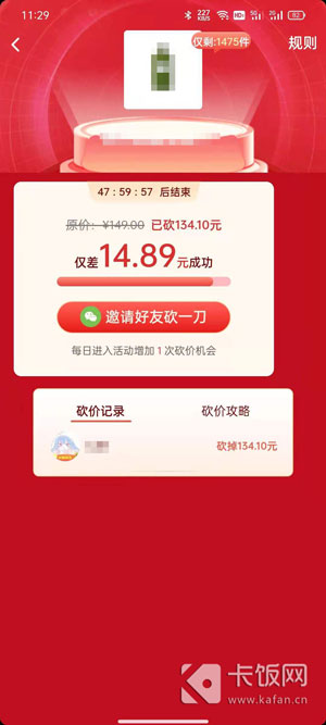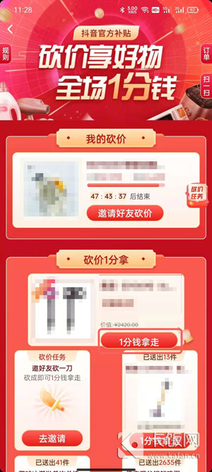 6、点击【1分钱拿走】进入后自动砍掉大部分的价格,之后需要通过做任务获得砍价次数来砍价;