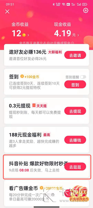 4、然后在任务中找到【抖音补贴 爆款好物限时秒杀】一项,点击【去逛逛】即可进入;