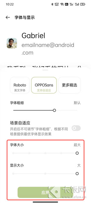 4、进入字体与显示设置之后,下滑找到【字体大小】、【显示大小】,滑动滑块到右侧,点击 【应用】;