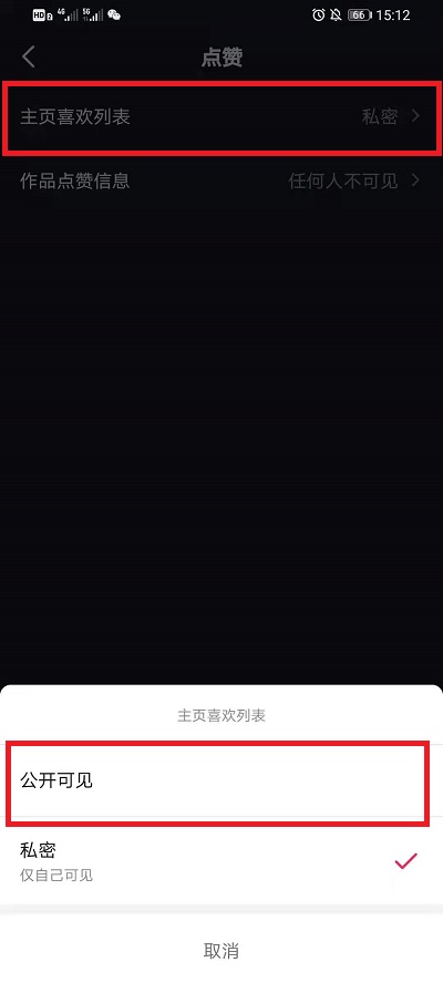 4、在界面中点击【主页喜欢列表】在弹出的界面中点击【公开】即可。