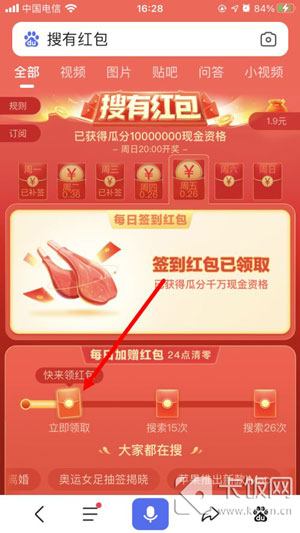 7、当我们搜索的次数达到6次、15次、26次之后,在搜有红包活动页面点击【立即领取】;