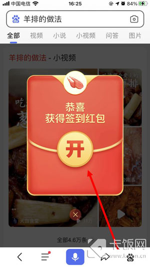 6、完成指定任务搜索,并浏览5秒之后,点击右下角的【红包】返回,再次搜索其他的内容;