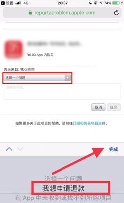 7、最后在跳转到官网后,点击下拉框选择【我想申请退款】,点击【完成】;