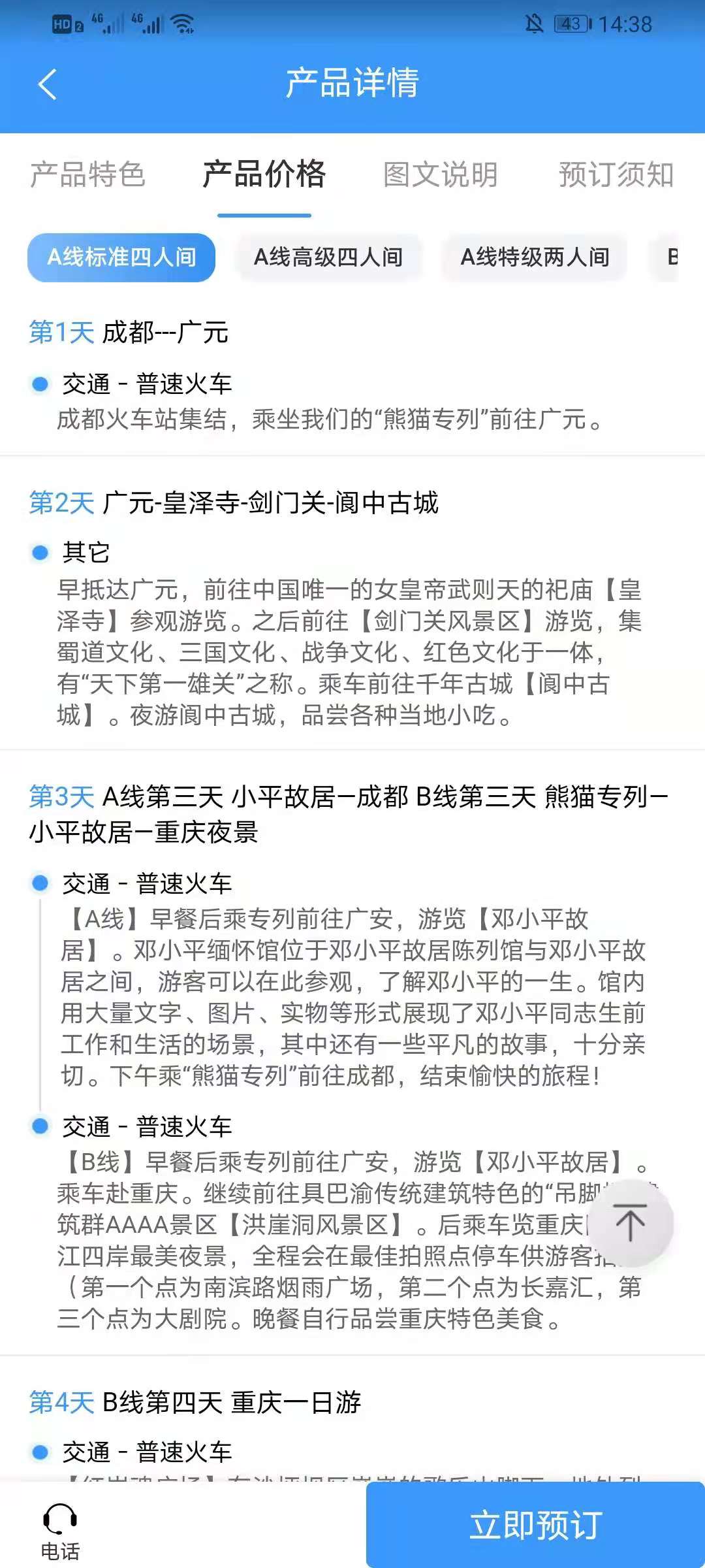 两款熊猫专列,其中成都出发的有两条路线,分别是:A:成都-广元-皇泽寺-剑门关-阆中古城-小平故居-成都;