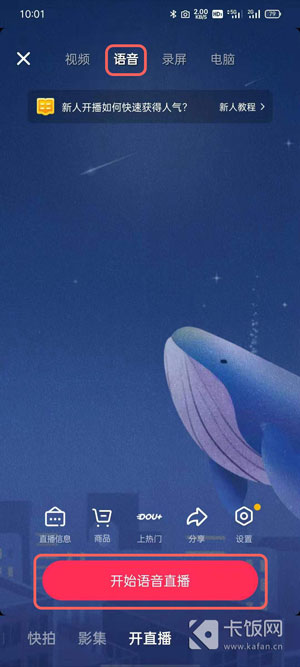 3、然后点击右上角的选项切换到【语音】,点击下方的【开始语音直播】;