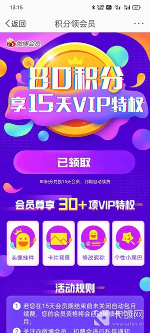 8、最后自动返回到活动页面,该页面提示我们应该成功领取了微博15天会员;