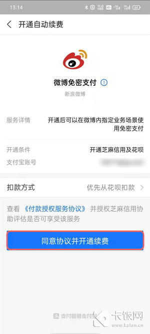 6、授权成功后,继续跳转到支付宝微博免密支付开通页面,点击【同意协议并开通续费】,注意后续需要取消自动续费,避免自动购买一个月微博会员;