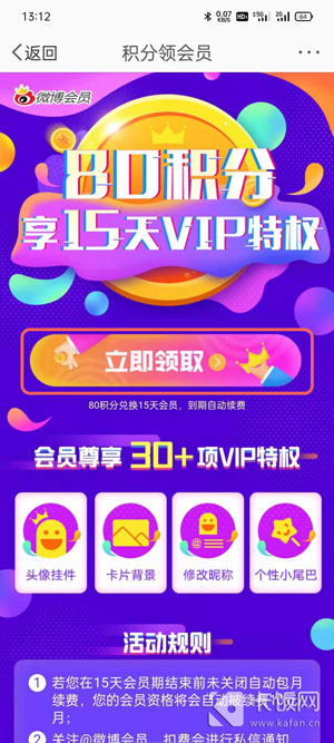 4、跳转到积分领会员活动页面后,点击屏幕中间的【立即领取】;