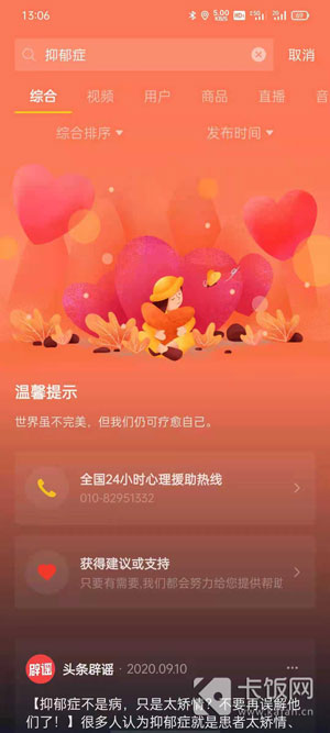 5、还有大家都知道的“抑郁”、“抑郁症”等,在最下方还会出现全国24小时心理援助热线、获得建议或支持等信息。