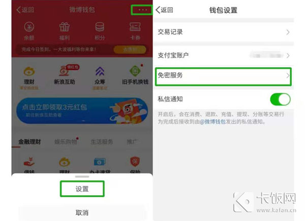 取消后,需要通过微信钱包查看是否取消,打开微博进入【我】的页面选择【微博钱包】——>点击右上角的【…】——>选择【设置】——>【免密服务】——>选择对应的免密支付服务——>最后点击选项直接解约即可。