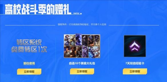 领取奖励:免费转区1次、自选10个英雄大礼包、7天双倍经验卡