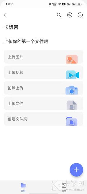 1、打开手机上的阿里云盘app,在首页文件中点击右下角的【 】新建;