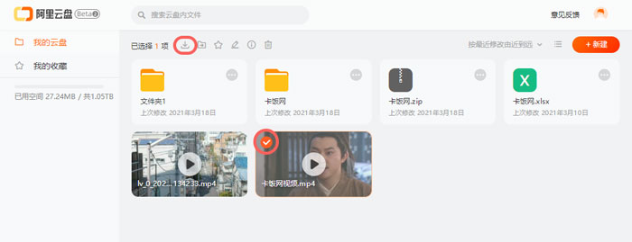 4、如果是网页版,则通过网页版阿里云盘,勾选需要下载的视频,点击上方的【下载】;