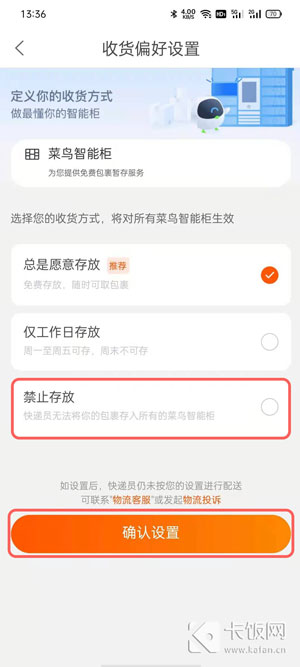 7、同样的,菜鸟智能柜也可以设置禁止存放,设置完成后点击【确认设置】。