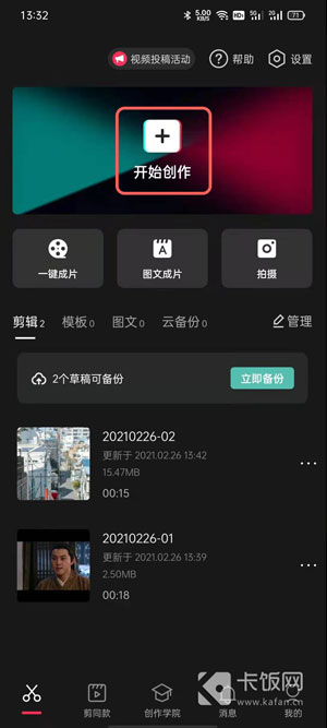 5、打开任意一款剪辑软件,例如剪映app,选择开始创作,先选择第一段,再选择第二段,将其导入剪辑;