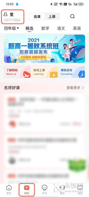 2.也可以通过下方的【网校】进入网校页面,点击左上角的【昵称】进入个人中心;