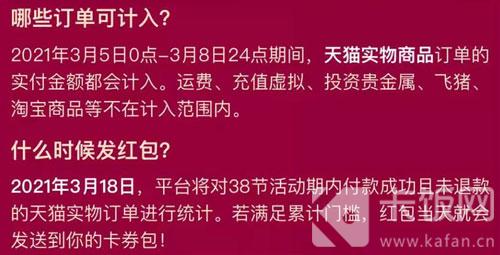 2、在2021年3月5日0点——3月8日24点期间,购买的实物商品的实付金额满300元;