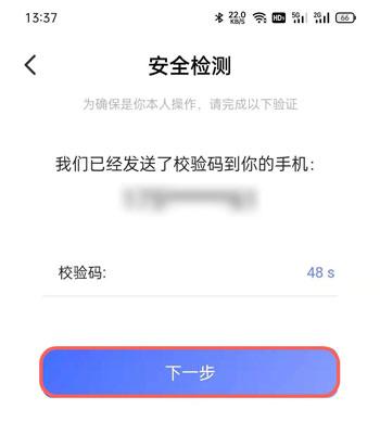 4、通过验证后,还需要进行安全检测,将接收到的验证码输入,点击【下一步】;