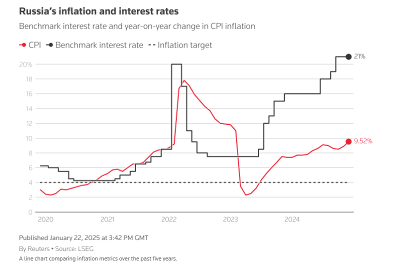 在俄罗斯央行于去年10月份将基准利率上调至21%后,该国的通胀率仍接近两位数。