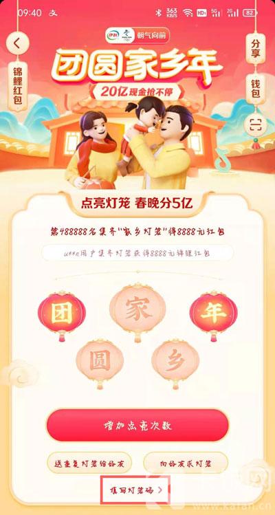 2.进入团圆家乡年活动页面后,点击下方的【填写灯笼码】一项,使用复制的灯笼码;
