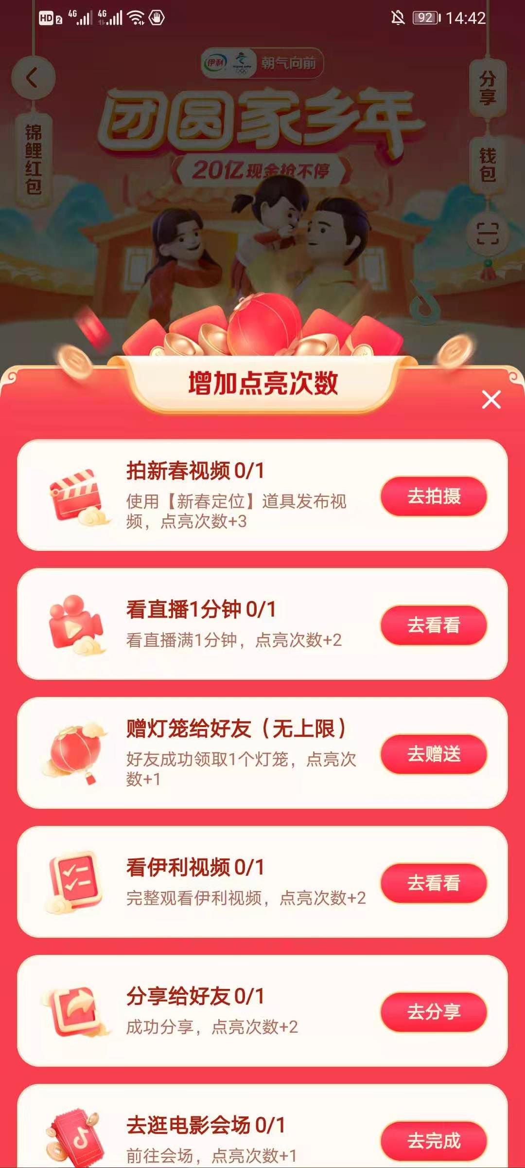 用户可以多做活动中的任务,通过完成抖音团圆中国年活动中的任务就可以增加我们点亮灯笼的次数,我们解锁了祈福灯笼以后,点亮灯笼时就可以直接点亮祈福灯笼,所以需要多完成任务获得点亮次数点亮祈福灯笼。