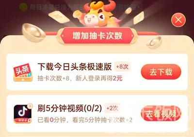 1)刷视频:观看5分钟的抖音极速版中的短视频,每观看5分钟可获得2次抽卡次数,最多可获得4次抽卡次数;