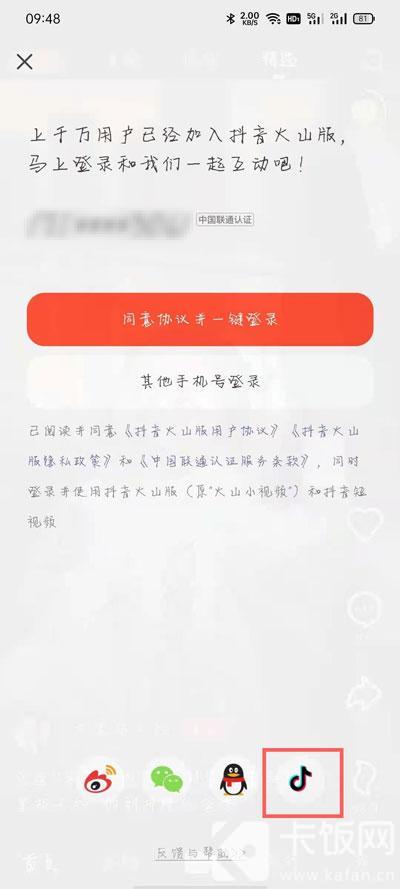 2.在登录页面的最下方找到【抖音】图标,点击使用抖音账号登录抖音火山版;