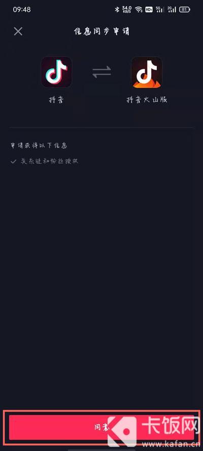 4.最后点击最下方的【同意】,同意抖音火山版获得抖音上的关系链、粉丝授权等信息即可完成授权。