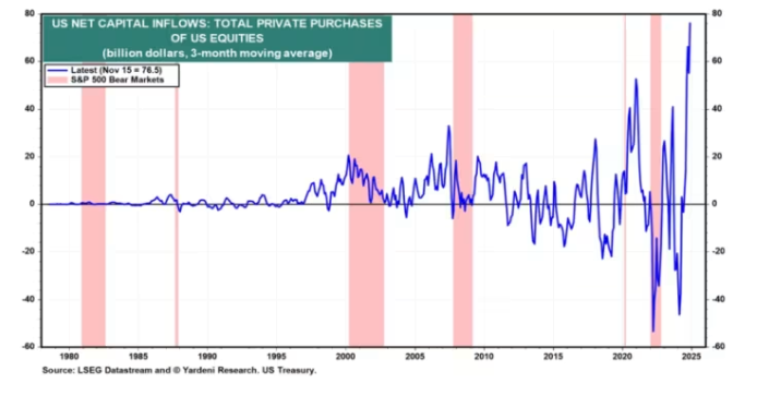 Yardeni Research总裁Ed Yardeni对数据进行了分析,发现外国人在过去三个月中以创纪录的765亿美元购买美国股票。