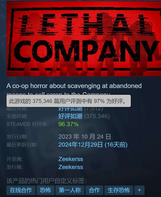 《致命公司》是一款具有独特玩法和体验的多人合作恐怖游戏,总体评价较高。截至发稿前,《致命公司》Steam评价为“好评如潮”,375346篇评测中97%的玩家给出了好评。