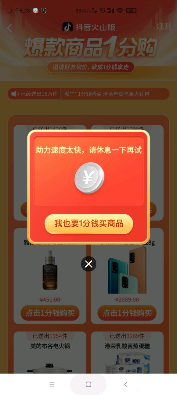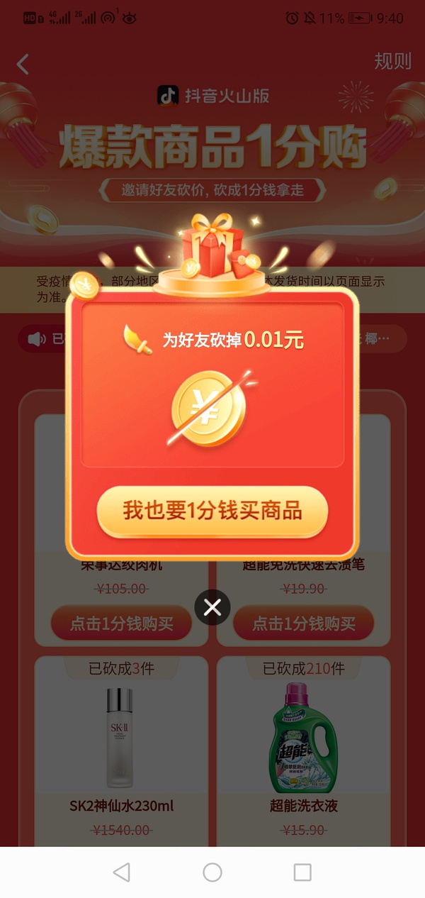 1、复制好友口令到抖音火山版APP打开,自动跳转至1分钱砍价活动;