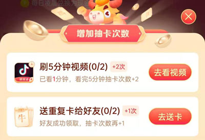 在抖音极速版的团圆家乡年活动页面,点击【增加抽卡次数】查看可以完成的任务,注意,日常任务只能获得金币,无法获得抽卡次数,完成任务要求,可获得对应的抽卡次数,点击抽卡,获得大量抽卡次数之后,有极大的几率可以获得自己缺少的卡;