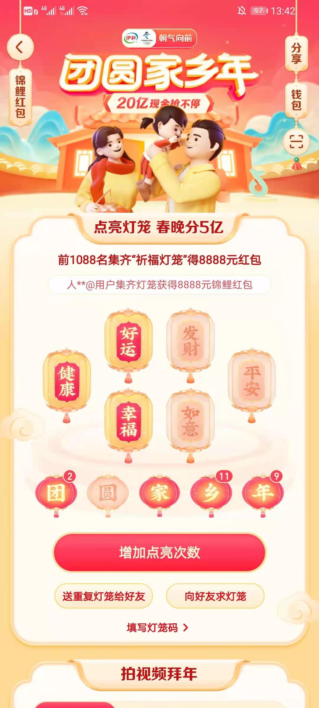 在团圆家乡年的活动页面,点击【增加点亮次数】按钮用户可以查看当日可以做或者是完成的任务,然后用户需要按照任务要求完成任务即可获得任务奖励相对应的点亮次数,获得的点亮次数越多就有更大几率获得自己缺少的灯笼。
